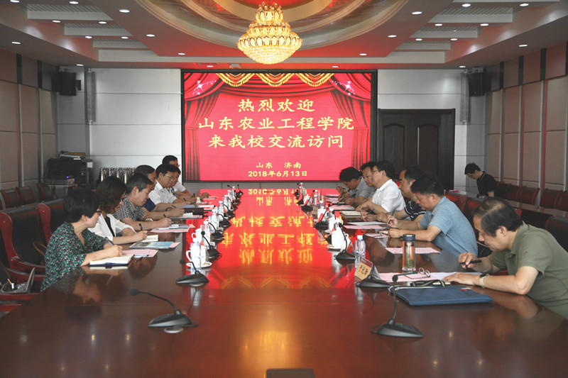 6月13日,山东农业工程学院校长王西奎、副校长杨振宁一行来威尼斯官网考察交流。校长林松柏、副校长刘德增会见了访问团一行。校长办公室、人事处、教务处、国际交流与合作处、审计处、实验管理中心负责同志参加了座谈。