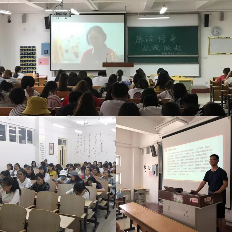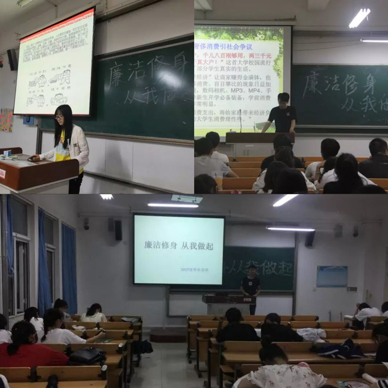 各学院积极开展“廉洁修身,从我做起”主题团日、班会或专题组织生活会,将廉洁文化建设与学风、班风、舍风建设有机结合,强化学生修身意识,传播廉洁修身、诚实守信的文明理念,开展“弘扬优良学风,倡导诚信考试”诚信教育,教育引导学生自觉树立正确的权力观、名利观、荣誉观,不断弘扬校园正能量。