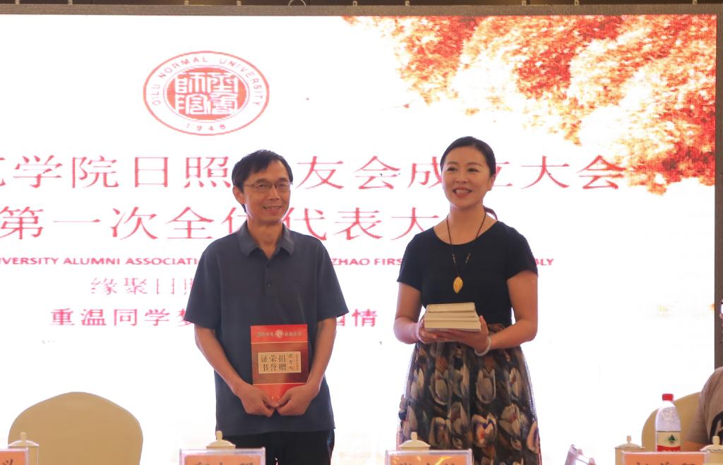 会上,日照校友会向母校捐赠了以校友夏立君为代表的日照地区作家的60部著作,孙磊向日照校友会颁发图书捐赠荣誉证书。
