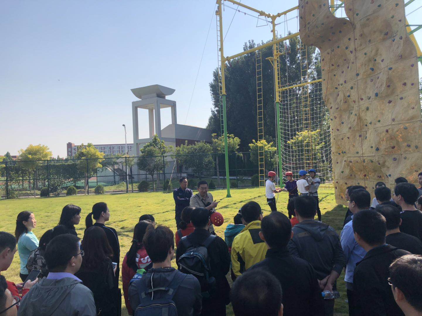 在户外教育拓展过程中,体育学院院长刘健教授介绍了基地建设和运行情况,各个项目教练员细致讲解了项目开展的方法、规则、要领及安全注意事项。86名学员们热情高涨、跃跃欲试,克服种种困难,高质量完成了“攀岩”、“胜利墙”、“空中走廊”等高难度项目,顺利完成了各项素质拓展项目。