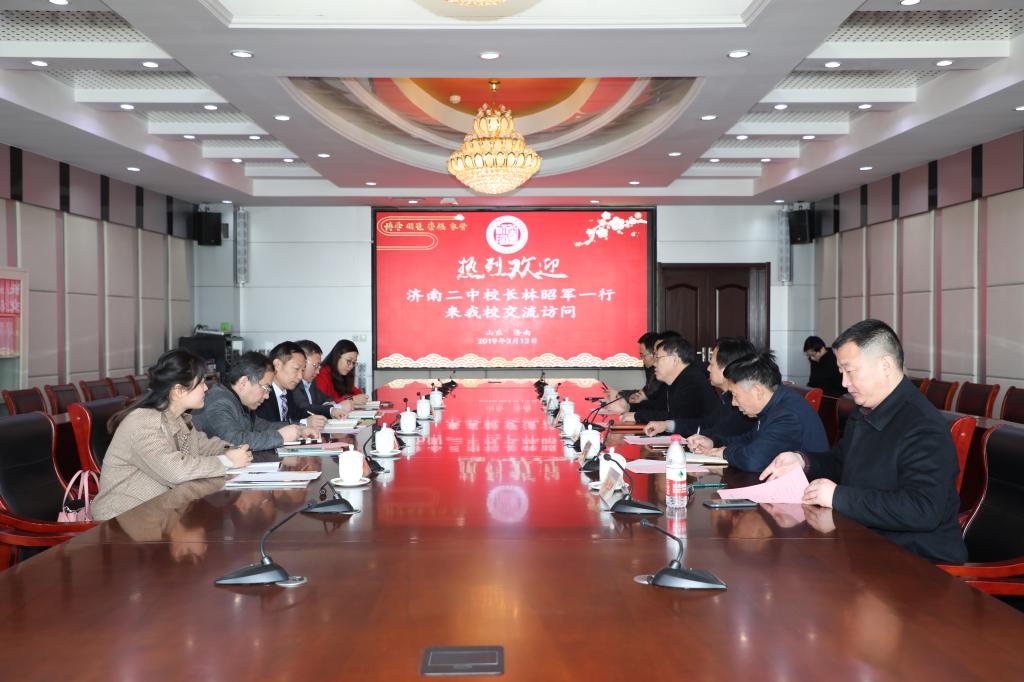 3月13日,济南第二中学校长林昭军,副校长李伟一行来威尼斯官网交流访问。学校党委副书记、校长林松柏会见了访问团一行,校长办公室、团委、教务处、国有资产管理处、山东省中小学师训干训中心负责人参加了会见。