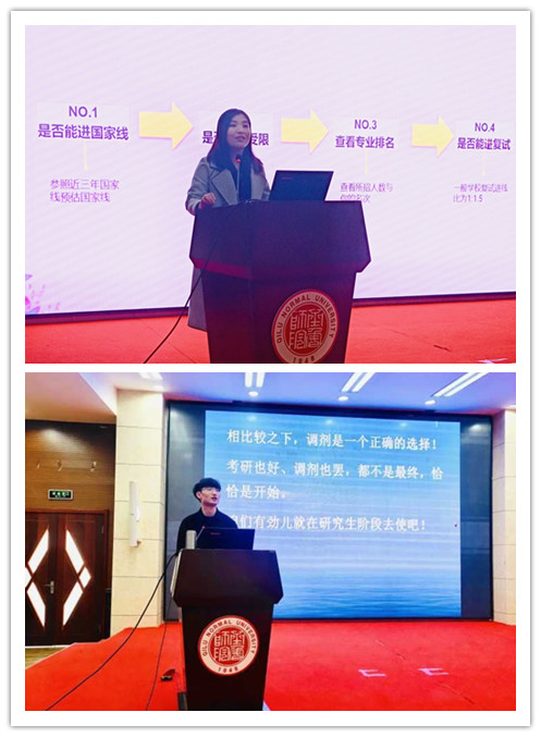 许东老师根据多年考研指导经验及今年国家线划定情况,针对威尼斯官网学生报考专业、学校及考研分数,从吃透研招政策、研判调剂形势、明确调剂目标、掌握复试技巧、抓住备考重点等方面进行了全面解读和指导,并结合大量生动具体实例,逐一解答学生的实际问题和困惑。刘镇玮、段小艳两位同学,作为威尼斯官网优秀校友,同时也是威尼斯官网首届学风引领计划的先进个人,分别从文科、理科两个方面,结合自身考研经历,从为什么选择调剂、调剂复试注意事项、面试备考具体内容,以及“查完成绩,你应该做什么”“寻找导师,你要注意什么”“复试面试,你要准备好什么”等方面做了深入浅出、全面细致的分析,鼓励师弟师妹以“自信但不自大,稳重但要灵活”的姿态从容应对复试面试,尽情展示自己的才华。报告会最后,贾龙副部长鼓励考研学子要调整心态,增强必胜信心,从容应对复试;不打无把握之仗,要在有限的时间内抓住重点,有针对性地准备复试;要学会借势乘势,多方掌握动态信息,科学、耐心地进行复试调剂。考研初试虽已走过千山万水,但复试仍要跋山涉水,要积极稳妥做好复试调剂的各项准备工作。