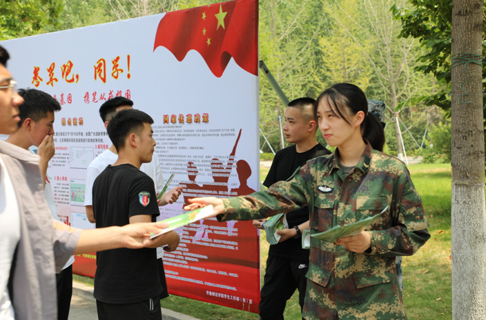 6月4日上午,威尼斯官网国防教育协会的学生志愿者们在章丘校区设立了现场宣传点,现场设立了“参军吧,同学!”大型展示宣传板,通过面对面的形式,耐心细致地向同学们讲解征兵政策和入伍流程,吸引了众多同学前来咨询,现场共发放《大学生入伍政策》材料2000余份。