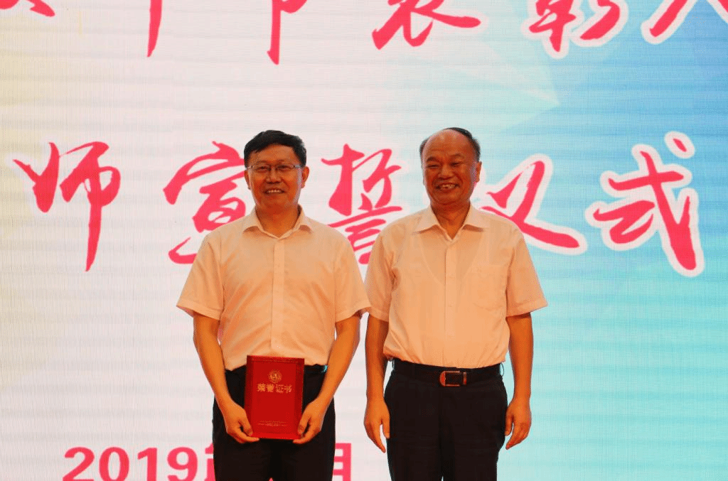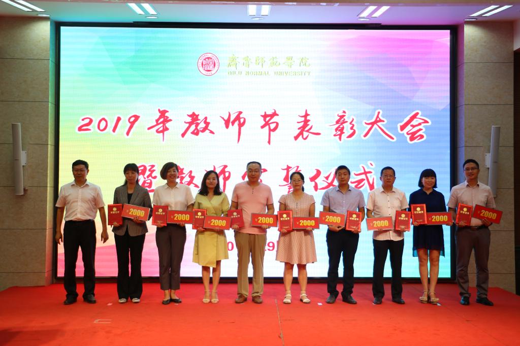 张福建副校长宣读了《关于表彰2019年教书育人楷模和最美教师的决定》和《关于表彰30年教龄教师的决定》。与会人员集体观看了教书育人楷模和最美教师事迹展播。王玉华书记为教书育人楷模颁奖;林松柏校长为最美教师颁奖;张福建副校长为30年教龄教师颁奖;王玉华书记为林松柏校长颁发30年教龄奖励证书。教师代表、教书育人楷模、教师教育学院教授刘文华和青年教师代表、物理与电子工程学院杨再发分别发言。在山东省优秀教师、山东省高校黄大年式教师团队负责人、学校教书育人楷模、最美教师、马克思主义学院教授李伟的带领下,大家举起右拳,面向国旗庄严宣誓,许下自己坚定的承诺和神圣的誓言:“培养优秀人才,传承中华文化,为国家富强和人类文明进步而努力奋斗!”