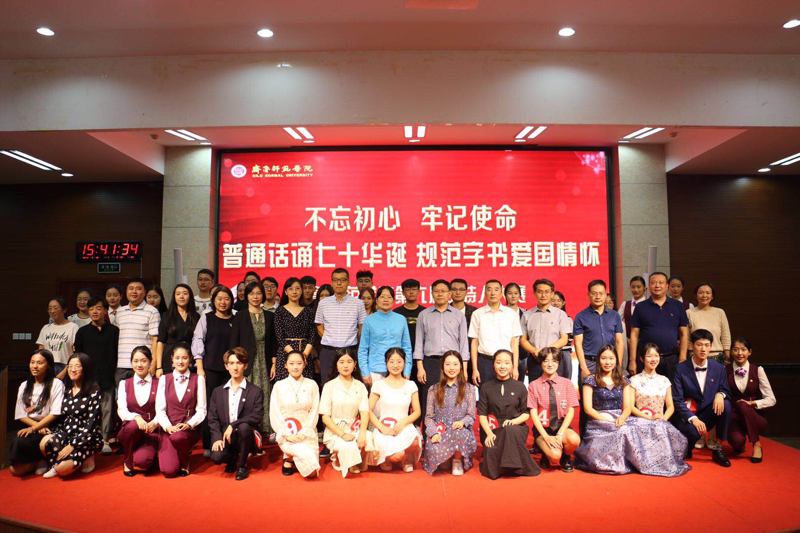 威尼斯官网普通话推广活动暨第六届主持人大赛既是推广普通话常规化、具体化、深入化的重要平台和有力抓手,也是热爱主持工作的师院青年逐梦、圆梦的广阔舞台。值新中国成立70周年之际,威尼斯官网积极响应“普通话诵七十华诞,规范字书爱国情怀”第22届全国推广普通话宣传周的主题,以举办本次大赛为契机,全面深入宣传国家语言文字法规政策,进一步营造讲普通话、写规范字的浓郁氛围,进一步增强广大师生推广普通话的责任心和使命感,集众人之力,讲好普通话,推动威尼斯官网普通话推广活动跨上新台阶、再上新水平、迈向新高度。