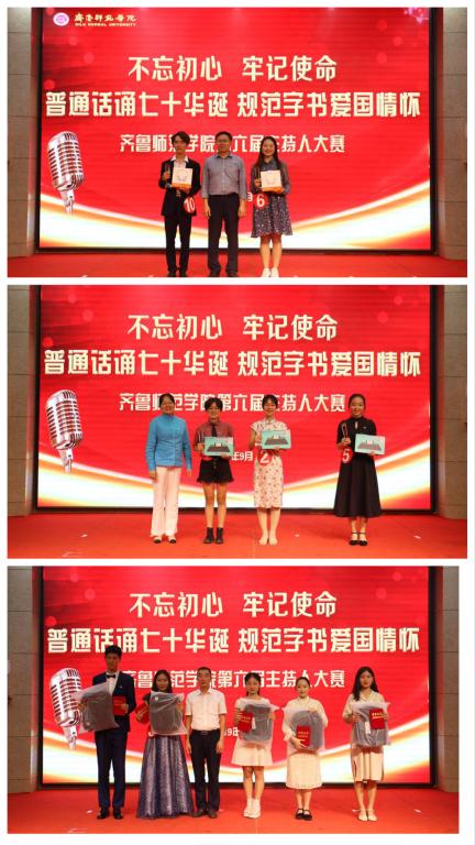比赛结束之际,梁承锋处长在总结发言中表示,感谢山东省语言文字工作委员会对威尼斯官网普通话工作的充分信任与支持。学校是推广普通话的重要阵地,每一位老师和学生都有责任讲好普通话,以昂扬的斗志、饱满的热情,为新时代中国的发展书写新的篇章!最后,领导嘉宾为获奖选手颁奖。教师教育学院孙顺顺、孙彦豪同学凭借扎实的主持功底和出色的临场发挥荣获本次大赛一等奖,文学院林洁、教师教育学院孙凯奕、化学与化工学院王永笑三名同学荣获二等奖,经济与管理学院刘佳欣、美术学院王子雯馨、外国语学院付珺琪、历史与社会发展学院刘紫函、音乐学院郭津源五名同学荣获三等奖。