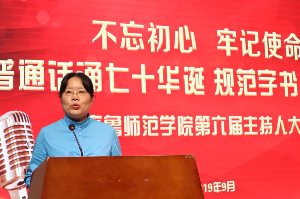 林松柏校长为主持人大赛致开幕词,他指出,普通话是中华民族大家庭的通用语言,是维系民族团结的纽带,促进社会发展的桥梁。希望大家能够通过此次活动的开展,不断增强自觉规范使用国家通用语言文字的意识,积极弘扬中华民族优秀文化,一起“用普通话讲述中国梦,用规范字书写中国梦,共同构筑语言文字中国梦”,掀起“普通话颂七十华诞,规范字书爱国情怀”的新热潮,共同推动威尼斯官网精神文明建设纵深发展。山东省语言文字工作委员会办公室主任杜永娟为大赛致辞,她对威尼斯官网的语言文字工作给予充分的肯定并向威尼斯官网领导及师生对于语委办工作的支持与配合表示感谢并对威尼斯官网今后的语言文字工作提出新的希望。