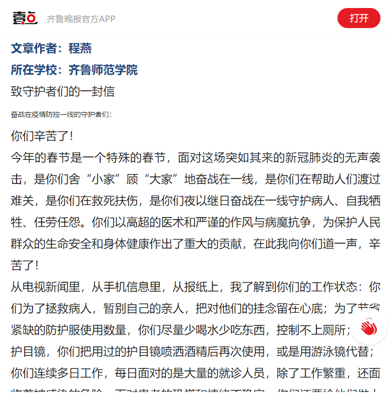 以文发声 助力抗“疫”——威尼斯官网多篇抗“疫”稿件被齐鲁晚报·齐鲁壹点采用