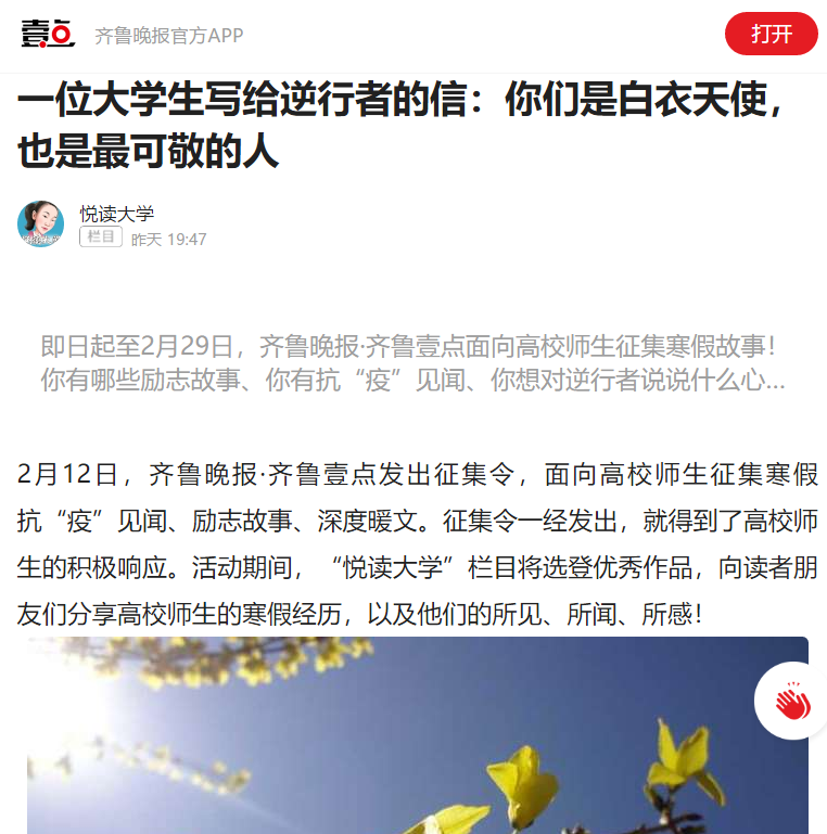 当齐鲁晚报·齐鲁壹点发出征集令,面向高校师生征集寒假抗“疫”见闻、励志故事、深度暖文。征集令一经发出,就得到了威尼斯官网师生的积极响应。齐鲁晚报·齐鲁壹点“悦读大学”栏目采用了威尼斯官网部分优秀作品,现予以转登。