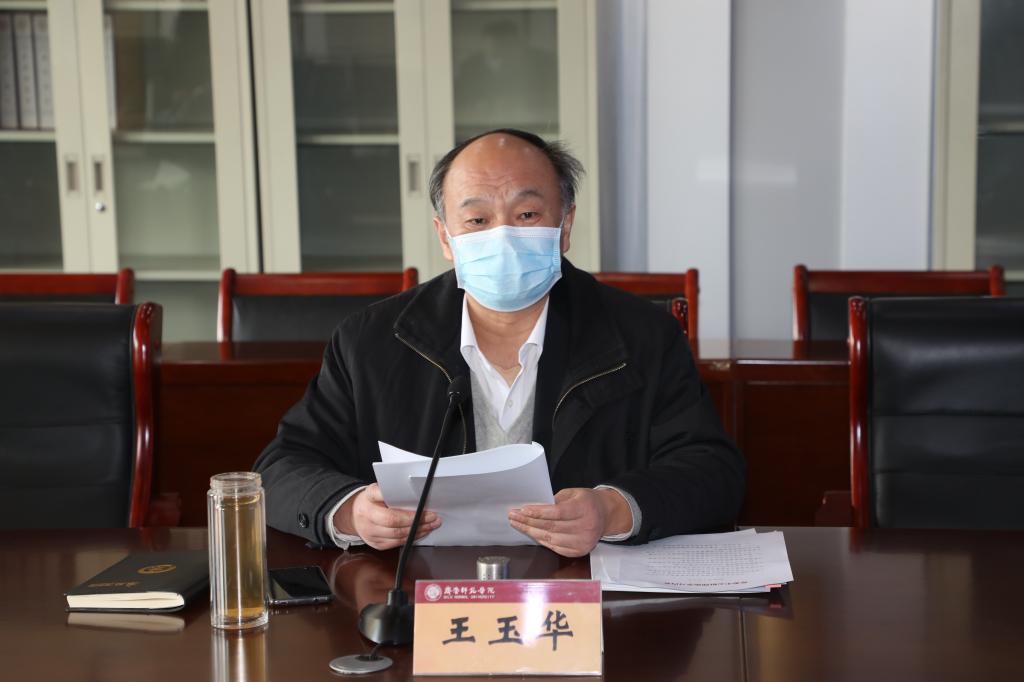 王玉华书记在讲话中结合最近中央、省委、省政府、省委教育工委、省教育厅和学校应对疫情防控的决策部署,谈了个人心得,并从三个方面对疫情防控工作提出要求。一是,把准形势任务,坚定必胜信心。王玉华书记指出,目前,全国上下一盘棋、集中力量办大事,凝聚起众志成城、共克时艰的强大能量,构筑起抗击疫情的铜墙铁壁,以必胜的信念、必胜的行动,求必胜的结果。我们要把抓好疫情防控工作作为践行初心使命、体现责任担当的试金石和磨刀石,自觉增强“四个意识”、坚定“四个自信”、做到“两个维护”,坚持“一把手”抓带头、“一张网”抓防控、“一盘棋”抓统筹、“一竿子”抓到底,坚守岗位、靠前指挥,守土有责、守土尽责。在中国共产党的坚强领导下,在习近平总书记的英明决策下,充分发挥中国特色社会主义制度优势,紧紧依靠各级党组织和广大人民群众,相信我们完全有能力打赢这场疫情防控阻击战。