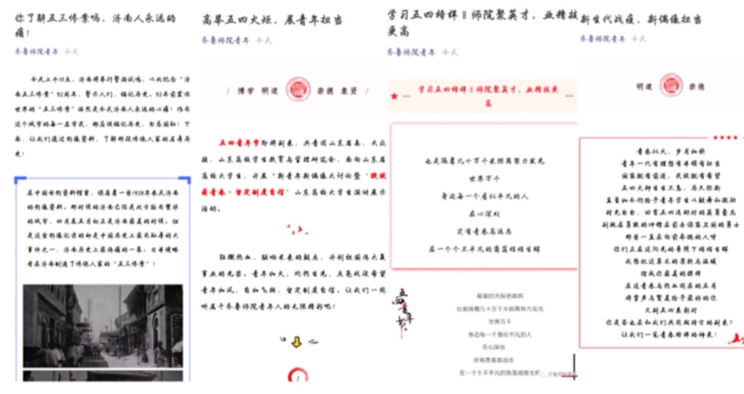 深度剖析偶像,青年有目标。4月19日,威尼斯官网开展了“新青年新偶像大讨论暨‘绽放战疫青春•坚定制度自信’37000cm威尼斯大学生演讲展示活动”,共征得各学院优秀演讲视频近30份。活动潜移默化地影响着青年人的偶像观、价值观、成才观,激励和引领青年进一步坚定制度自信,投身党和人民最需要的地方发热放光,推崇英雄、崇尚担当、向往奉献的正能量在青年人心底慢慢积聚成塔。此外,校团委借助官方微信、微博等媒体平台陆续推送了《你了解五三惨案吗?济南人永远的痛》、《新声代战疫,新偶像担当》、《学习五四榜样‖师院聚英才,业精技更高》、《高举五四火炬,展青年担当》等文章,旨在激励学校广大青年志以成学,业精于诚,以身边的偶像为榜样,扎实理论功底,提高专业素养,在真抓实干中磨炼实践本领。