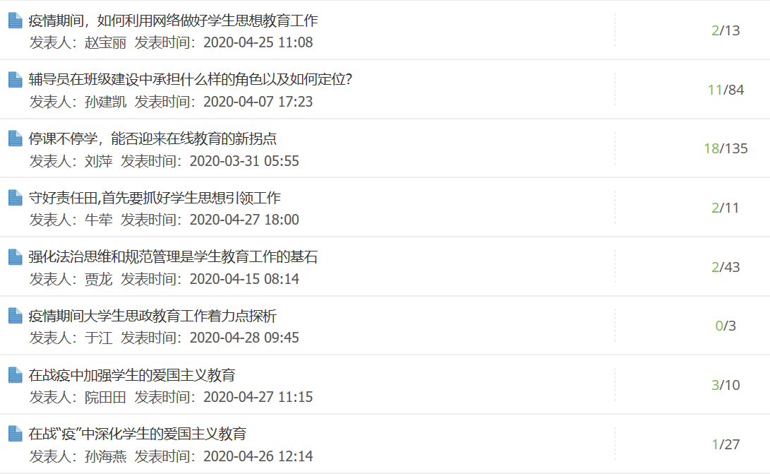 音乐学院党总支副书记马艳:面对突如其来的新冠肺炎疫情,很多人的学习、工作方式都随之发生了改变,辅导员的学生教育工作也是如此。面对学生教育工作从线上线下结合向完全线上形式的转变,我们也要及时转换工作思路,去学习利用互联网开展学生教育工作。心有大我,责任在肩。疫情面前,每个人都是战斗者、奋斗者,都应各尽其责、有所担当,而越是艰难的考验,越会让我们快速成长。我也将以此次培训学习为工作契机,开拓各种渠道加强对学生的思想政治教育工作,树立学生的社会责任感和担当意识,引导学生完成蜕变,成为有理想、有本领、有担当的社会主义合格建设者和可靠接班人!
