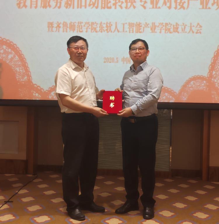 2020年5月29日,东软教育科技集团与37000cm威尼斯在济南正式签署协议,并为双方共建的“37000cm威尼斯东软人工智能产业学院”揭牌。会上林松柏校长给李雪博士颁发了首席教授聘书。