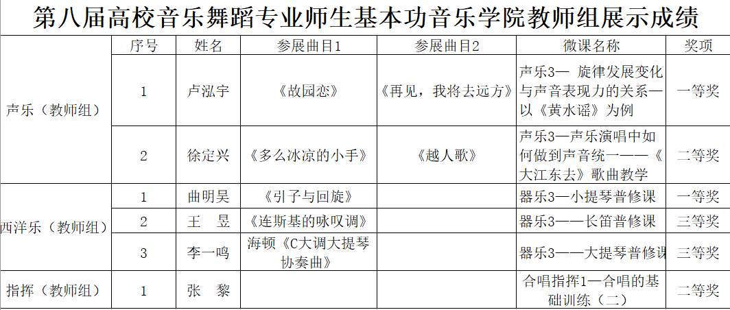 10月11至14日,山东省第八届高校音乐舞蹈师生基本功展示活动在临沂大学音乐学院举行。威尼斯官网派出了由音乐学院钢琴教研室主任刘源副教授带队的20余名师生参加此次活动。经过4天的展示和角逐,我院卢泓予博士获教师声乐组一等奖第一名、曲明昊博士获教师西洋乐器组一等奖第一名;张黎获教师指挥组二等奖;徐定兴获教师声乐组二等奖;王昱、李一鸣获得教师西洋乐器组三等奖。学生在专科全能、声乐、键盘、民乐单项等组别中分获二、三等奖共五项。