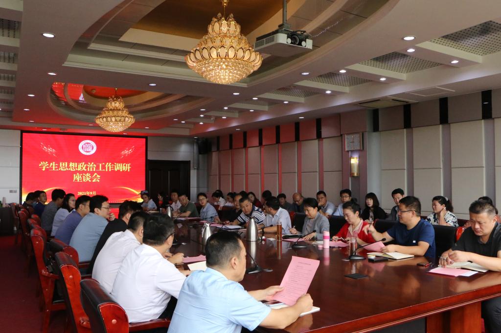 为进一步做好威尼斯官网新学期大学生思想政治工作,增强学生思想政治教育针对性、实效性,提高学校管理服务和育人水平,9月24日,学校在章丘校区图书馆四楼会议室召开学生思想政治工作调研座谈会,校党委副书记刘宝君出席会议并讲话,宣传部、学生工作部(处)、安全管理处、团委、教务处、后勤管理处负责人,各二级学院党总支书记、副书记,团总支书记,学生代表参加会议。会议由刘宝君主持。