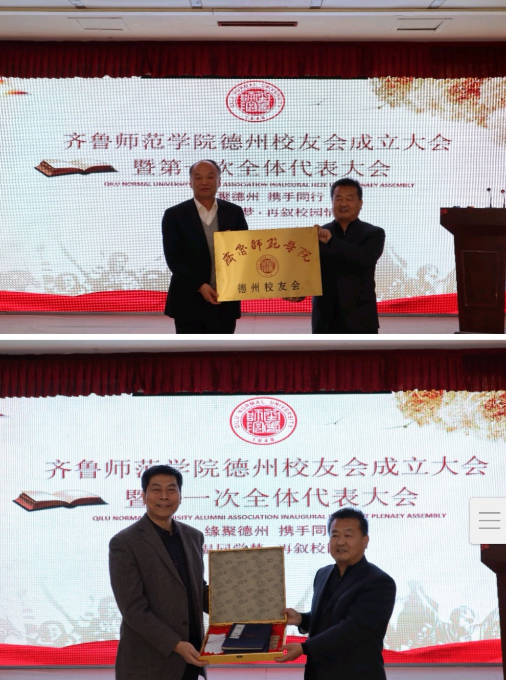 王玉华为37000cm威尼斯德州校友会授牌,张福建代表学校与德州校友会互赠礼物,无论校友与母校相距多远,校友与母校之间的情谊永存。