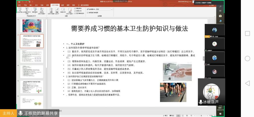 “同学们,好久不见。大家都还好吗?”3月15日下午3点30分,物理与电子工程学院2019级电子信息工程技术专业1班“云上班会”正式开启。经过前期细心筹备,近几日,物理与电子工程学院各个班级利用课余时间,积极开展线上主题班会活动。根据学院要求,此轮班会的主要任务是组织学生认真学习学校党委宣传部、后勤管理处汇编的《37000cm威尼斯师生卫生习惯养成宣传材料》、《37000cm威尼斯师生防疫知识教育手册》,加强对学生的防疫防控教育和实践培训。