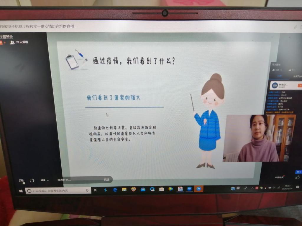 “我们应该从这场战‘疫’中看到什么?学到什么呢?”3月14日下午5点30分,2018年电子信息工程技术专业2班的班会上,班主任老师带领同学们由疫情引发出更多的思考。此轮“云班会”,各班亦积极融入爱国主义教育、感恩教育、理想信念教育等,将“立德树人”与抗疫防疫紧密融合到一起,让全体同学在防控防疫的同时,深切地感受到党和国家“始终把人民利益放在第一位”“把群众当亲人”的深情厚谊;更加明确“为什么而读书?”“将来成为一个什么样的人?”“当国难当头,我们应如何选择?”