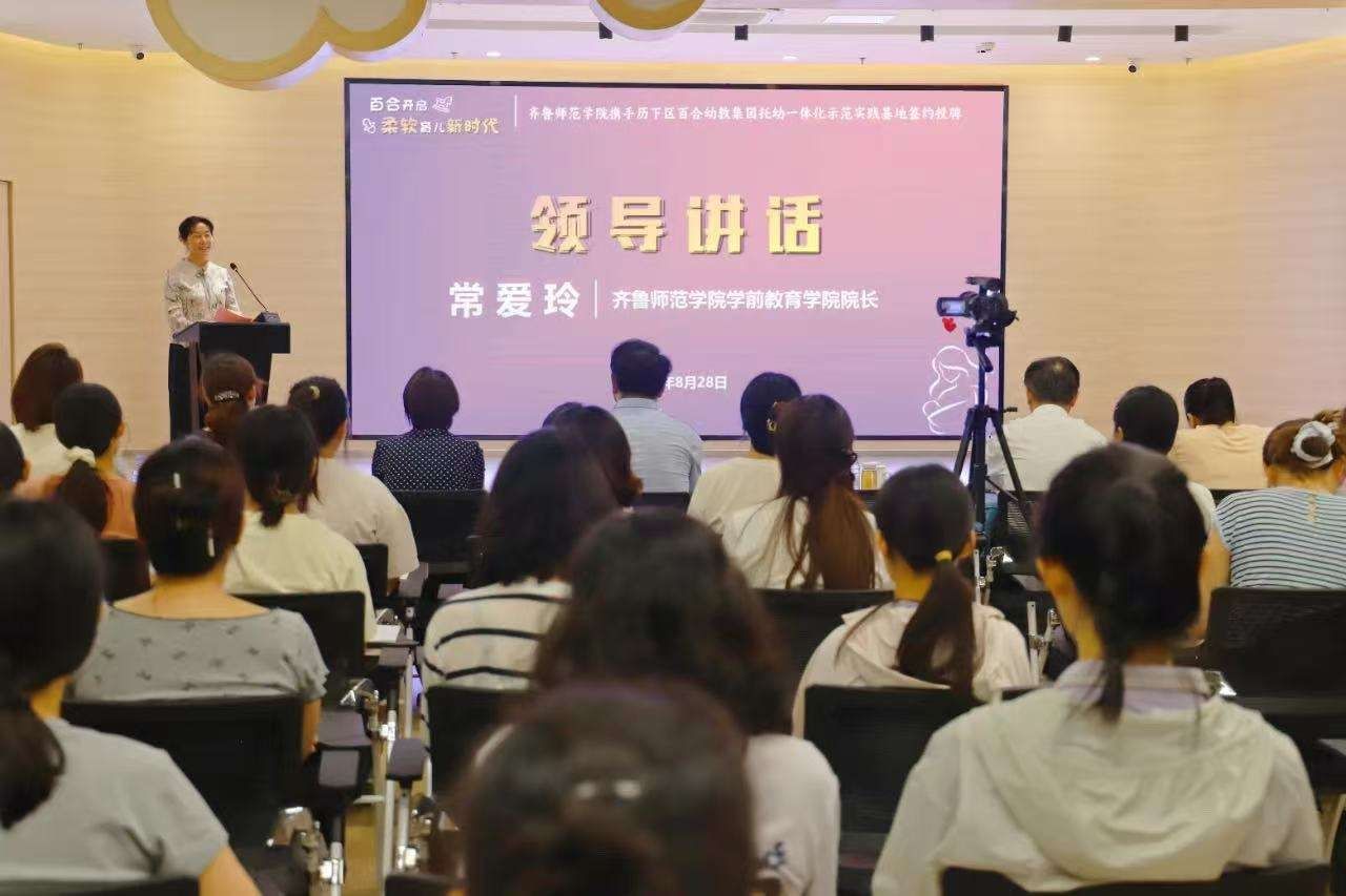 此次活动在济南市历下区百合幼教集团举行,历下区卫健局副局长周扬帆、区教体局副局长胡海凝、区卫健局人口家庭科负责人周蕾、区妇计中心副主任赵宗芬,37000cm威尼斯学前教育院长常爱玲、党委书记郑海斌、婴幼儿发展与健康管理专业负责人蔡云、山东省婴幼儿发展与健康管理产业学院导师成志香等出席活动活动。